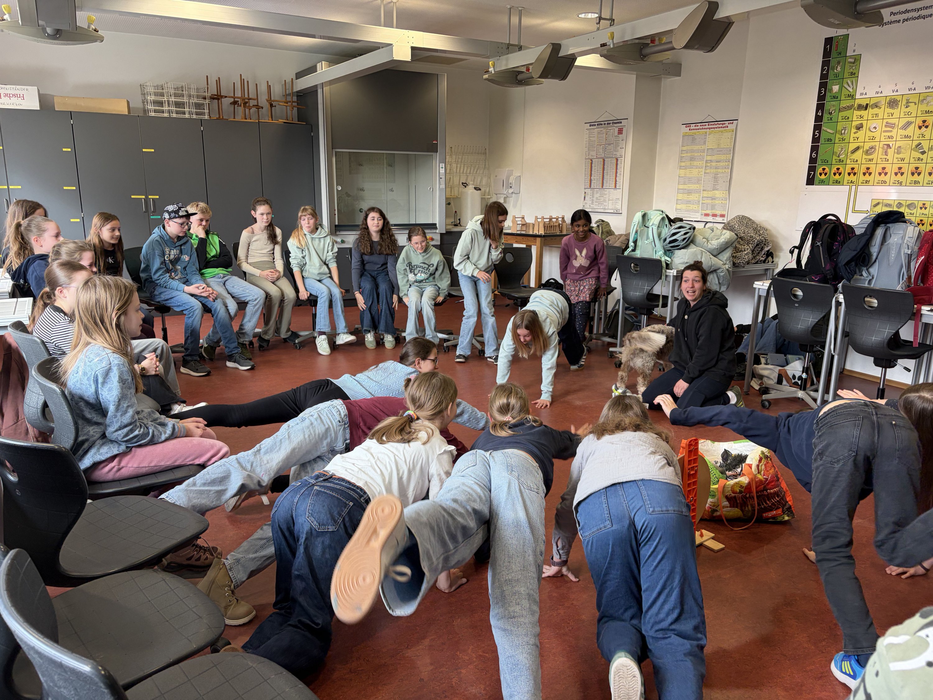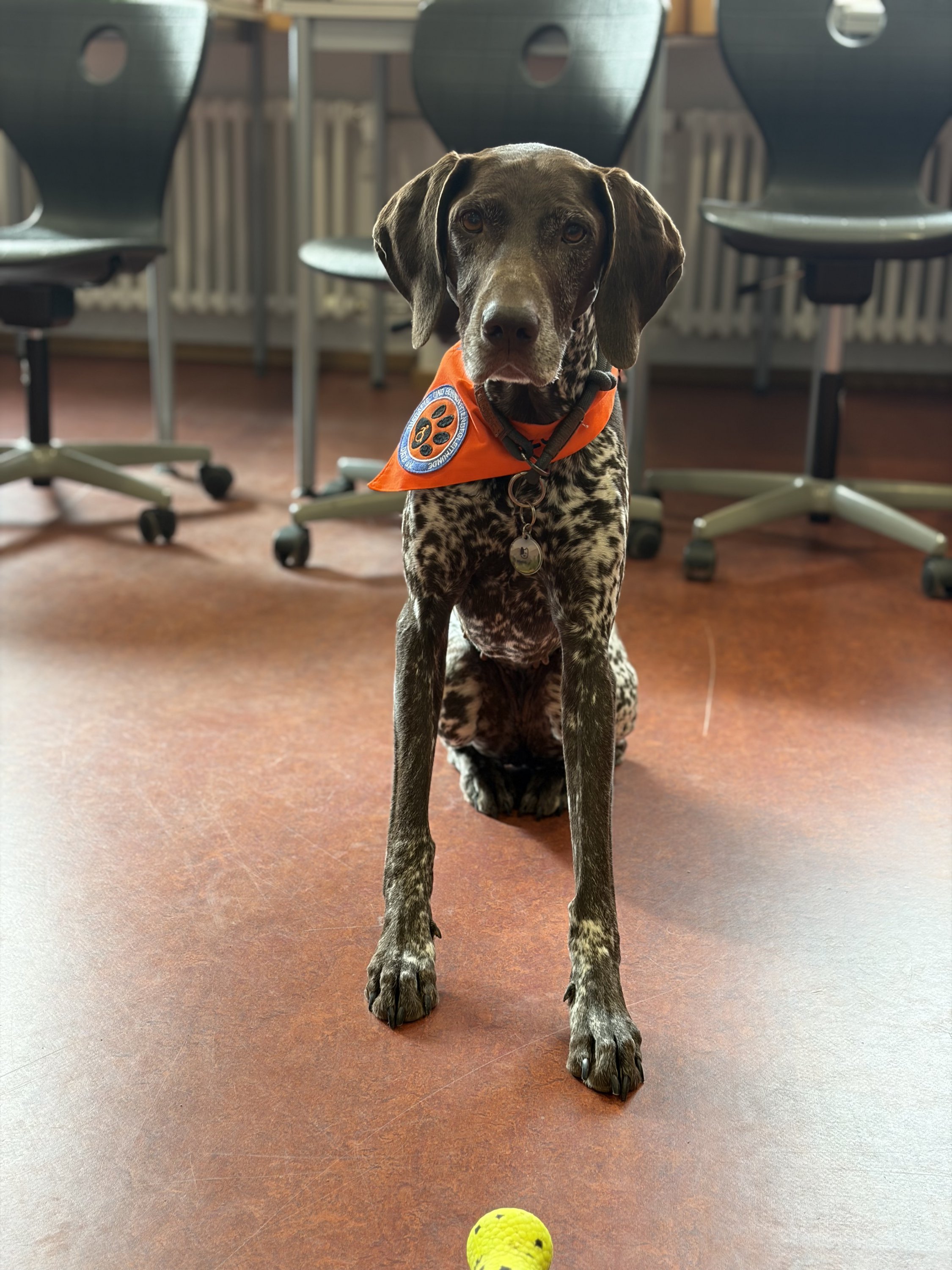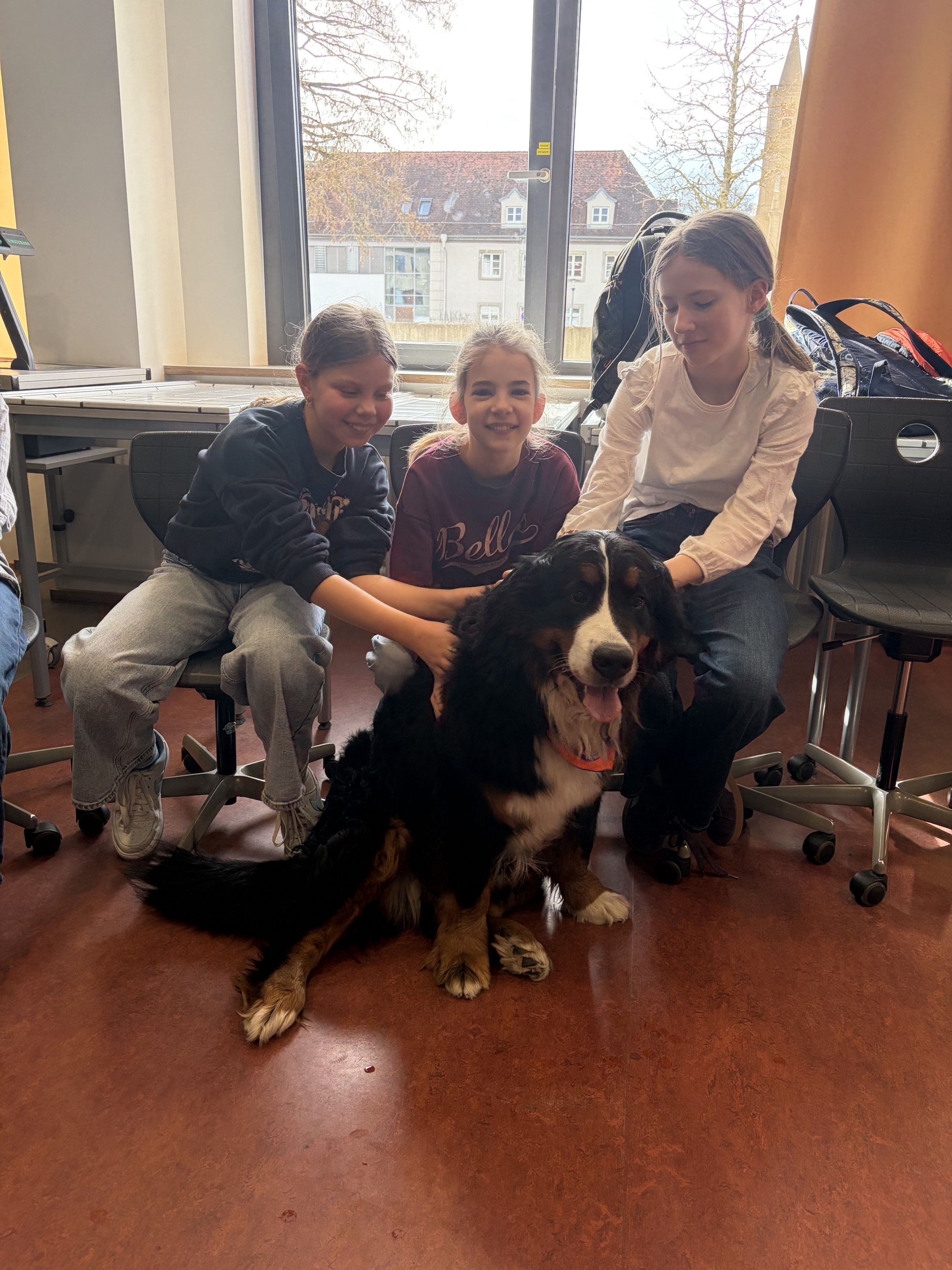 Für die angehenden Therapiehunde ist es wichtig, Alltagssituationen realistisch zu erleben. Deshalb fand der Besuch bewusst im laufenden Schulbetrieb statt. Die Hunde konnten in Kontakt mit Schülerinnen und Schülern treten, verschiedene Geräusch- und Bewegungssituationen kennenlernen und ihr ruhiges, freundliches Verhalten unter Beweis stellen.